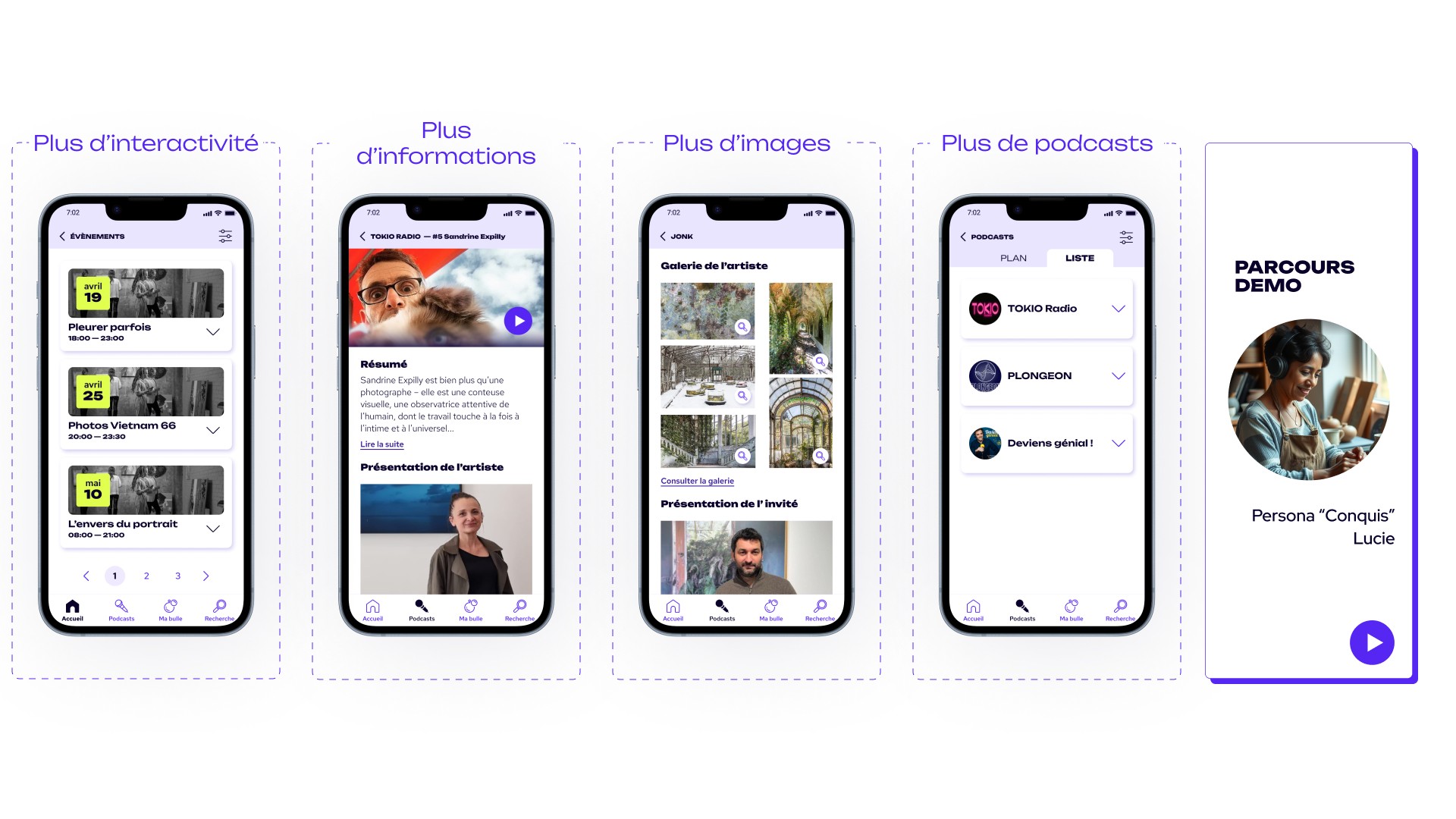 • Interactive capsules mixing sound, visuals, and text for a richer experience.