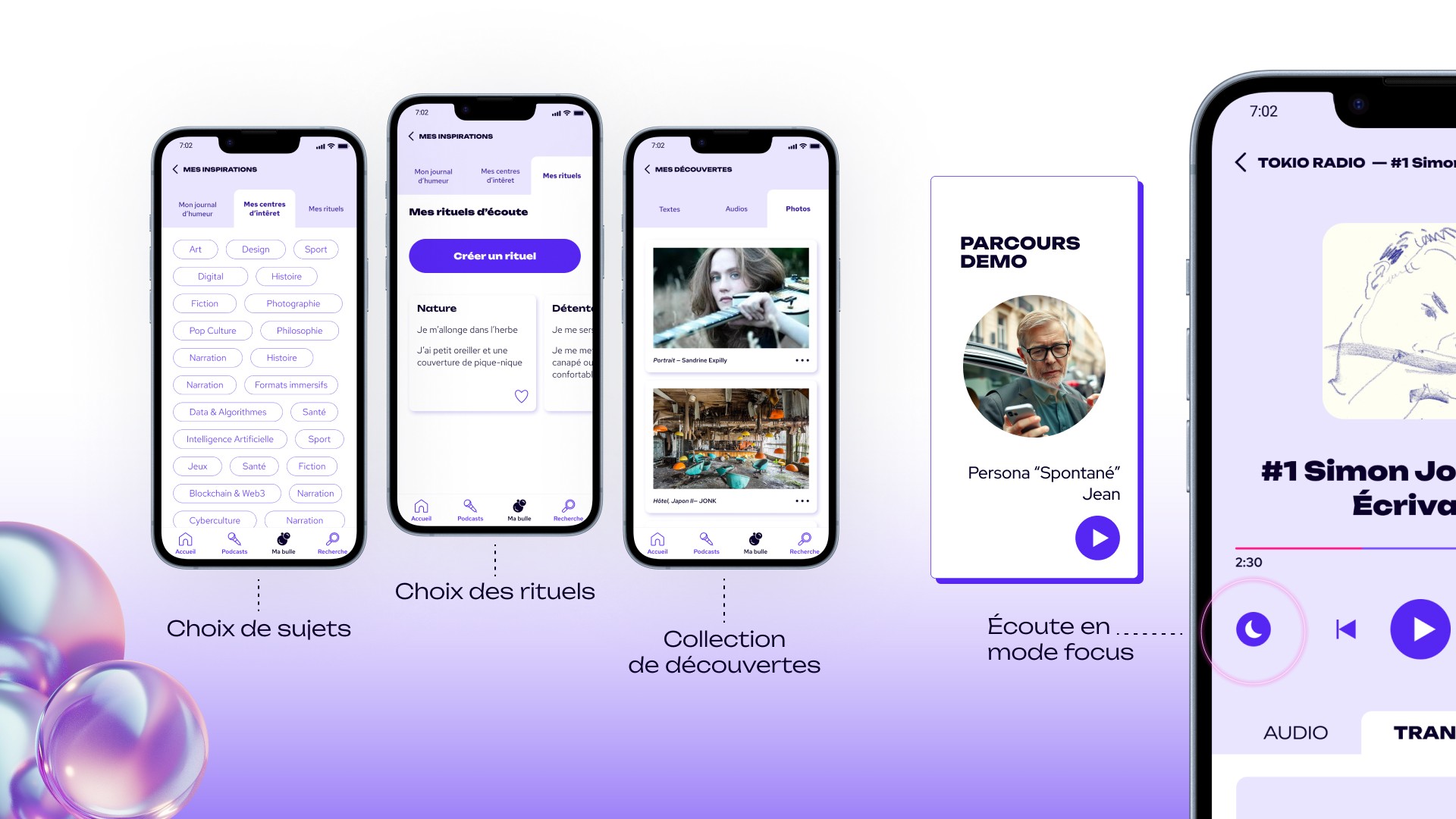 Following our exploration with TOKIO Radio (an existing French podcast accessible on Spotify and Apple Music) the solution evolved into a platform that now hosts other independent and immersive cultural podcasts as well : Podcaps.